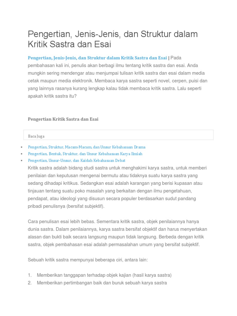 Berikut adalah pengertian singkat dan contoh soal mengenai materi bahasa indonesia yang terkait dengan resensi, esai, dan kritik. Latihan soal teks kritik dan esai. Jika kritik lebih bersifat menanggapi atau mengomentari, esai lebih ke opini pribadi. Dikutip dari bahan ajar mata kuliah kritik sastra (2018) karya dina gasong, kritik lahir karena manusia ingin mencari jawaban berarti. Obyek kajian dapat berupa karya atau fenomena.